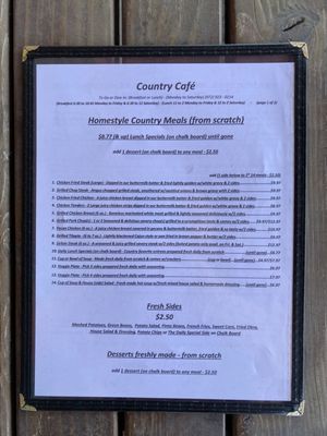 Country Cafe offers amenities such as Takeout, Wheelchair Accessible, Good for Kids, Pets Welcome, Outdoor Dining, Outdoor Parking, Accepts Contactless Payments, Takeout, Wheelchair Accessible, Good for Kids, ensuring a comfortable and convenient experience for clients.